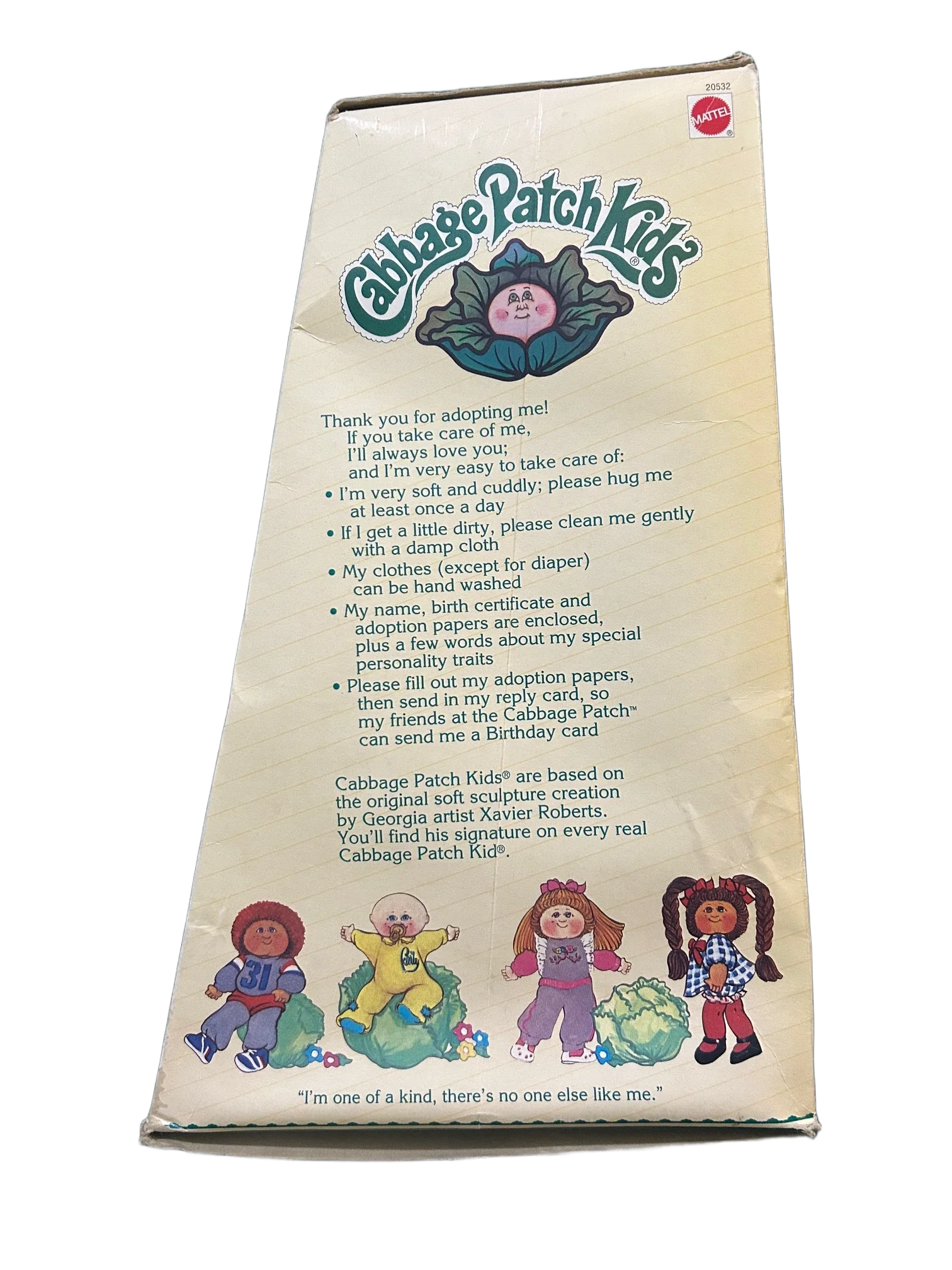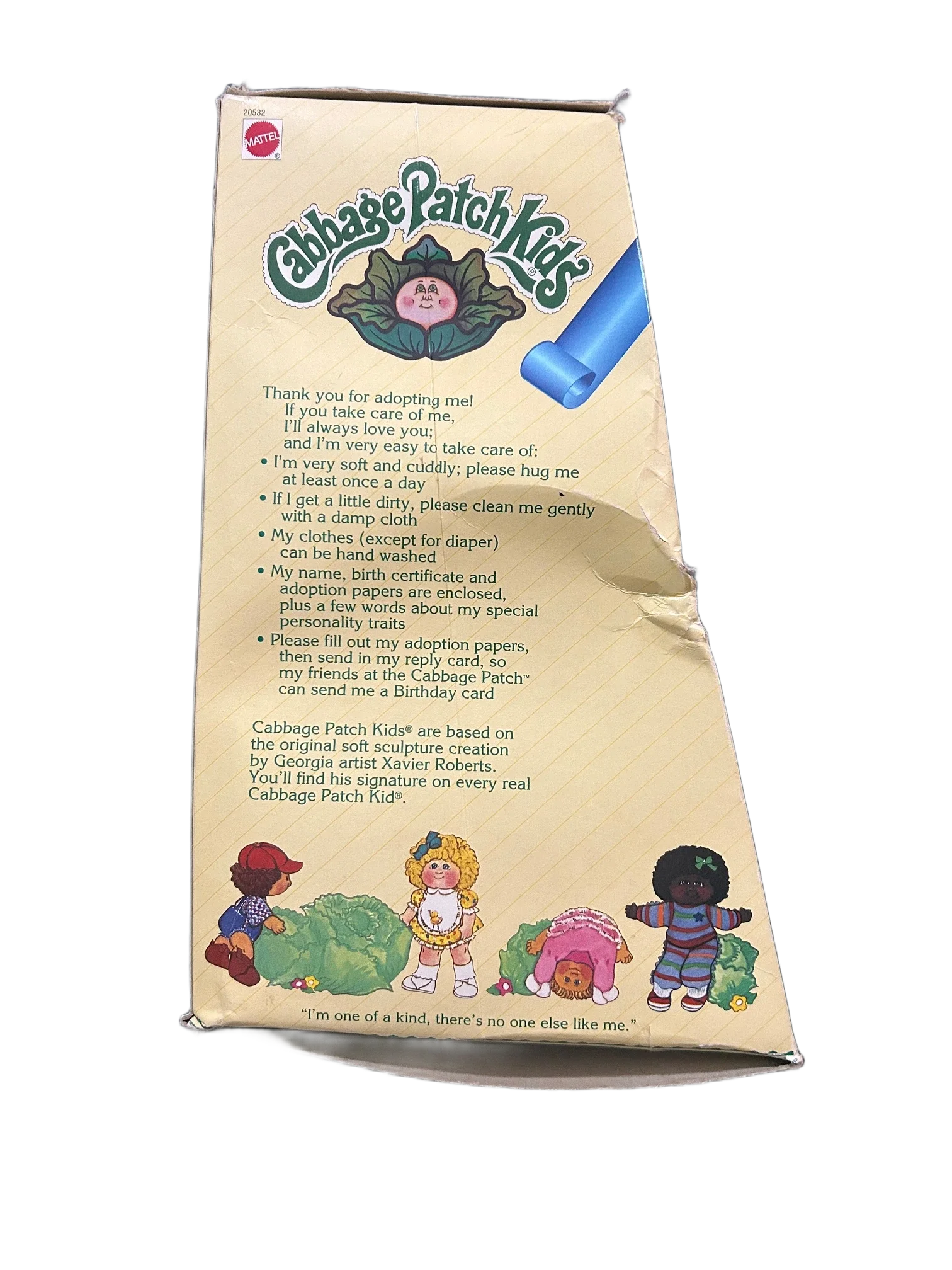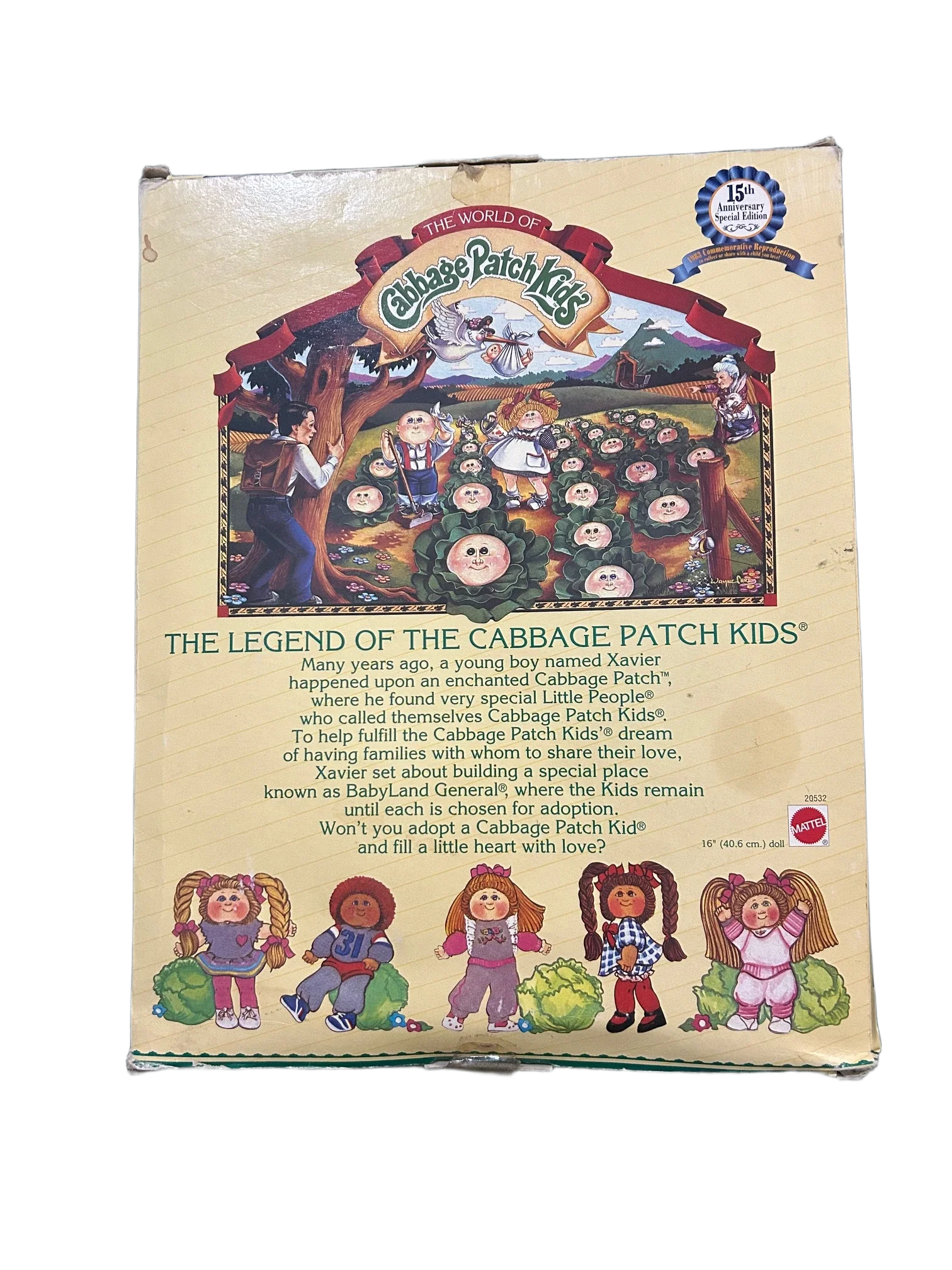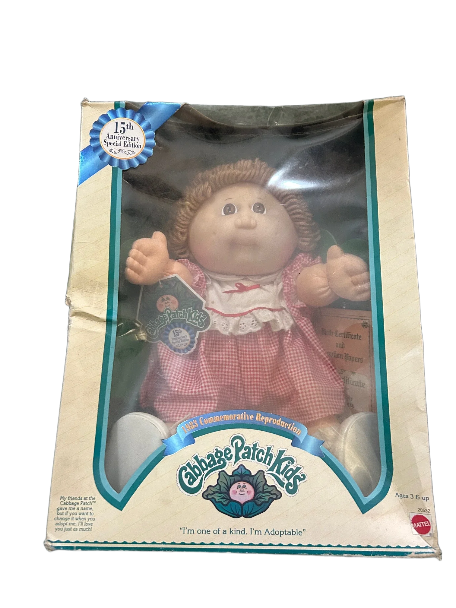 15th Anniversary Cabbage Patch Kids reproduction doll with packaging and papers. Box shows wear.