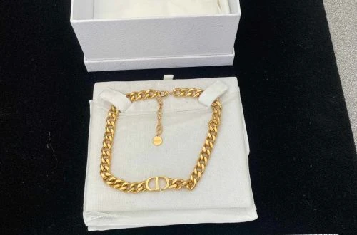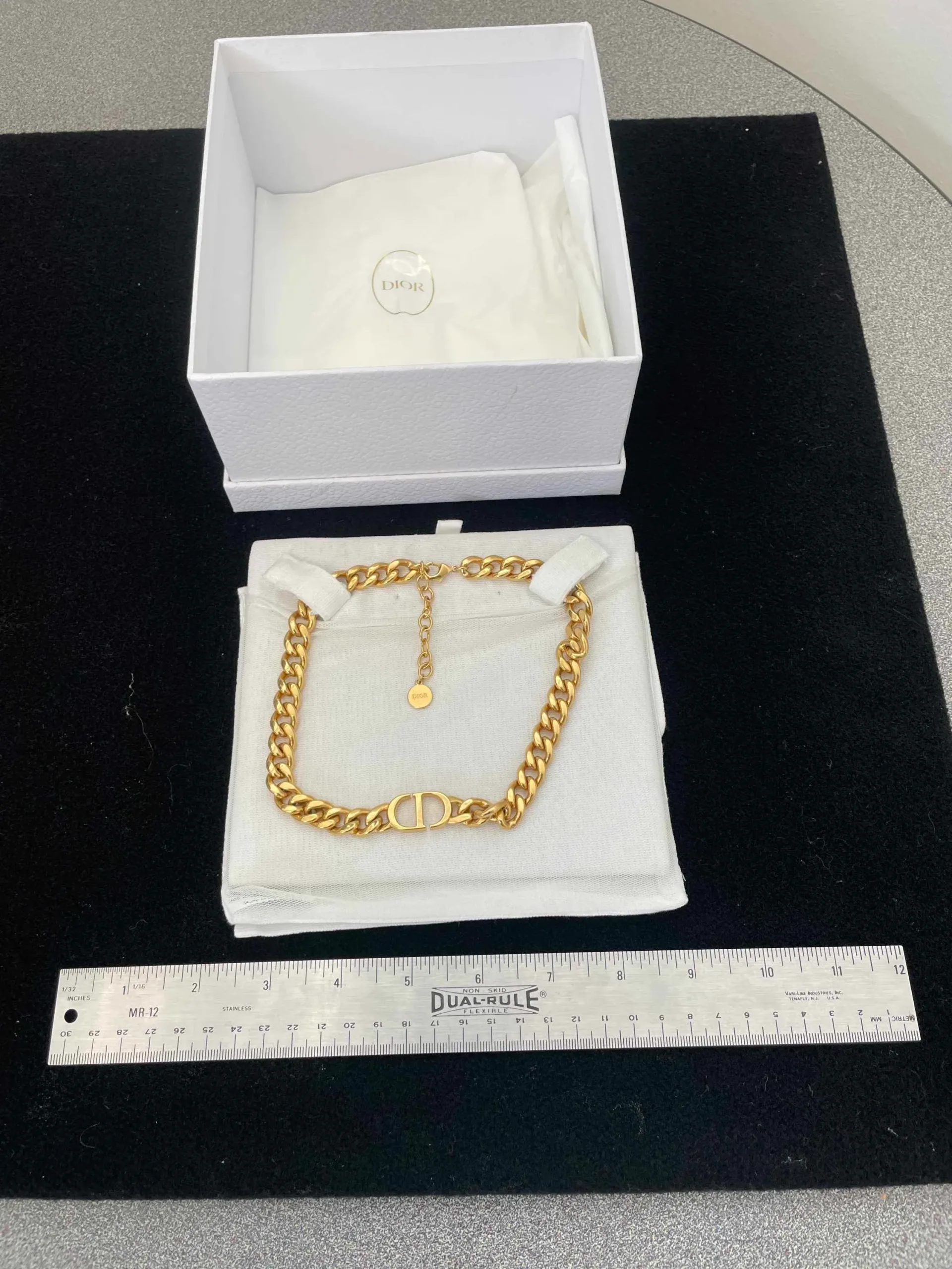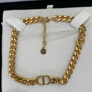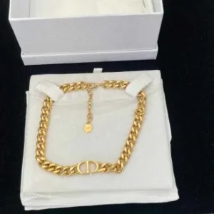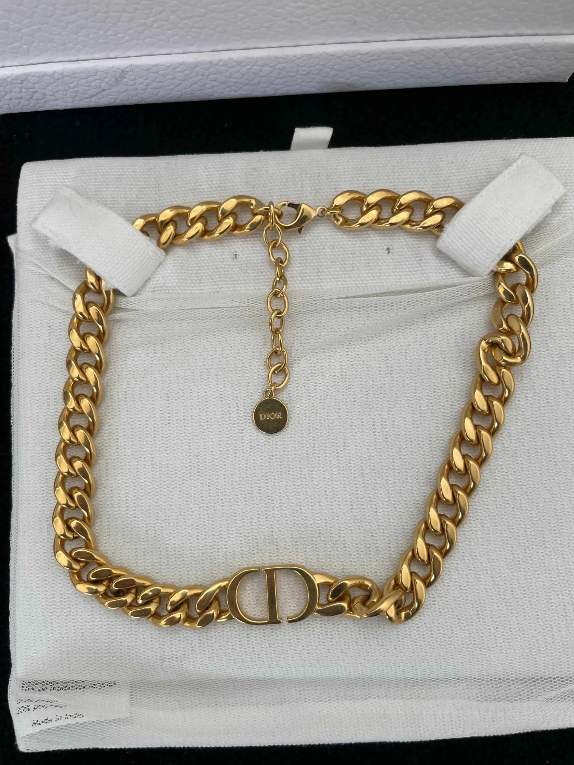 Christian Dior gold-tone chain choker necklace with CD detail. Includes branded box and pouch. Authenticity not verified. Sold as-is.