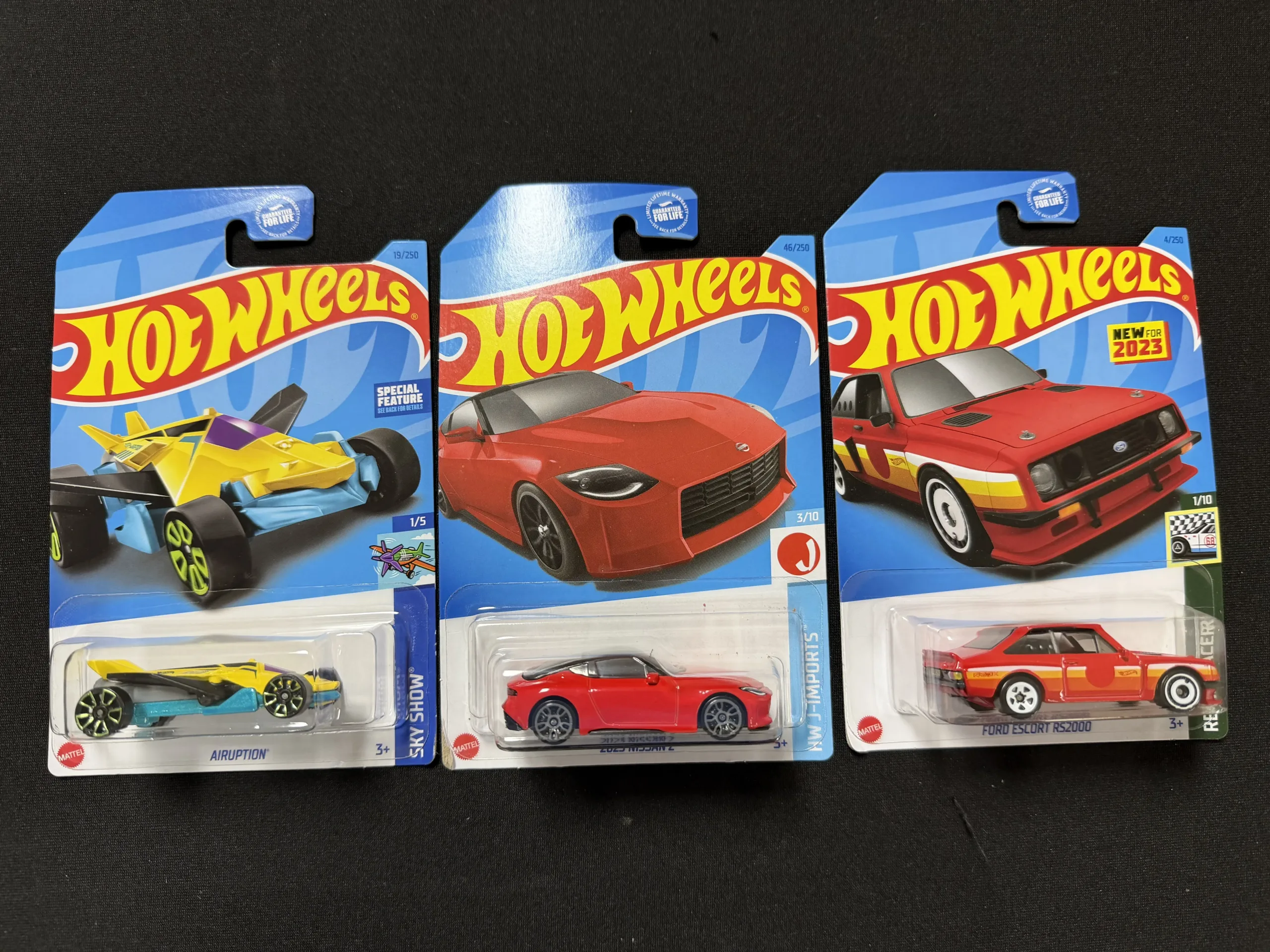 Three Hot Wheels vehicles in unopened packaging including Airuption, Nissan Z, and Ford Escort RS2000.