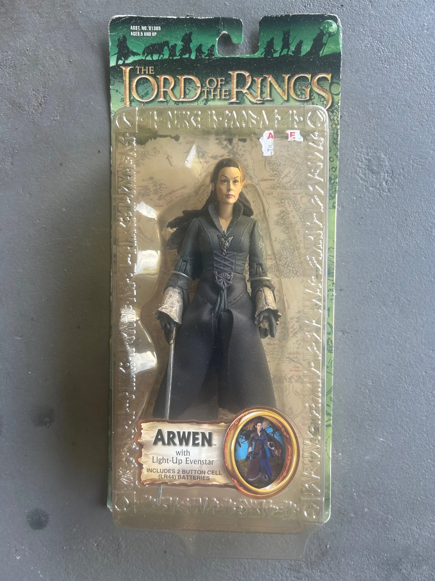 Arwen action figure from The Lord of the Rings series featuring light-up Evenstar accessory. Factory sealed in original packaging. Minor card wear present. Great collectible for LOTR fans.