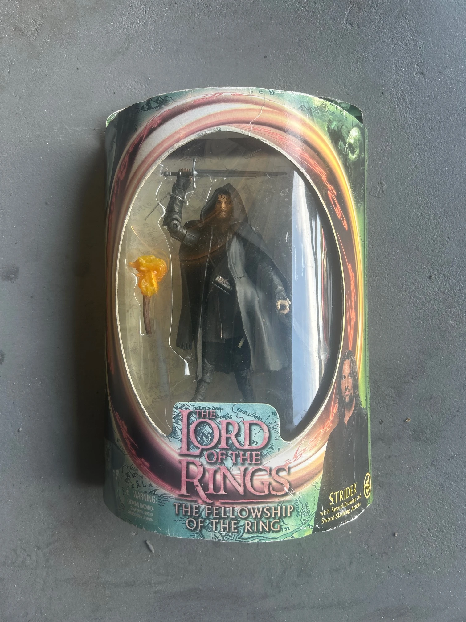 Official The Lord of the Rings: The Fellowship of the Ring Strider (Aragorn) action figure. Includes sword-swinging action feature and accessory. Item remains sealed in original packaging with visible shelf wear and slight creasing to the blister/card. Great collectible for LOTR fans and action figure collectors.
