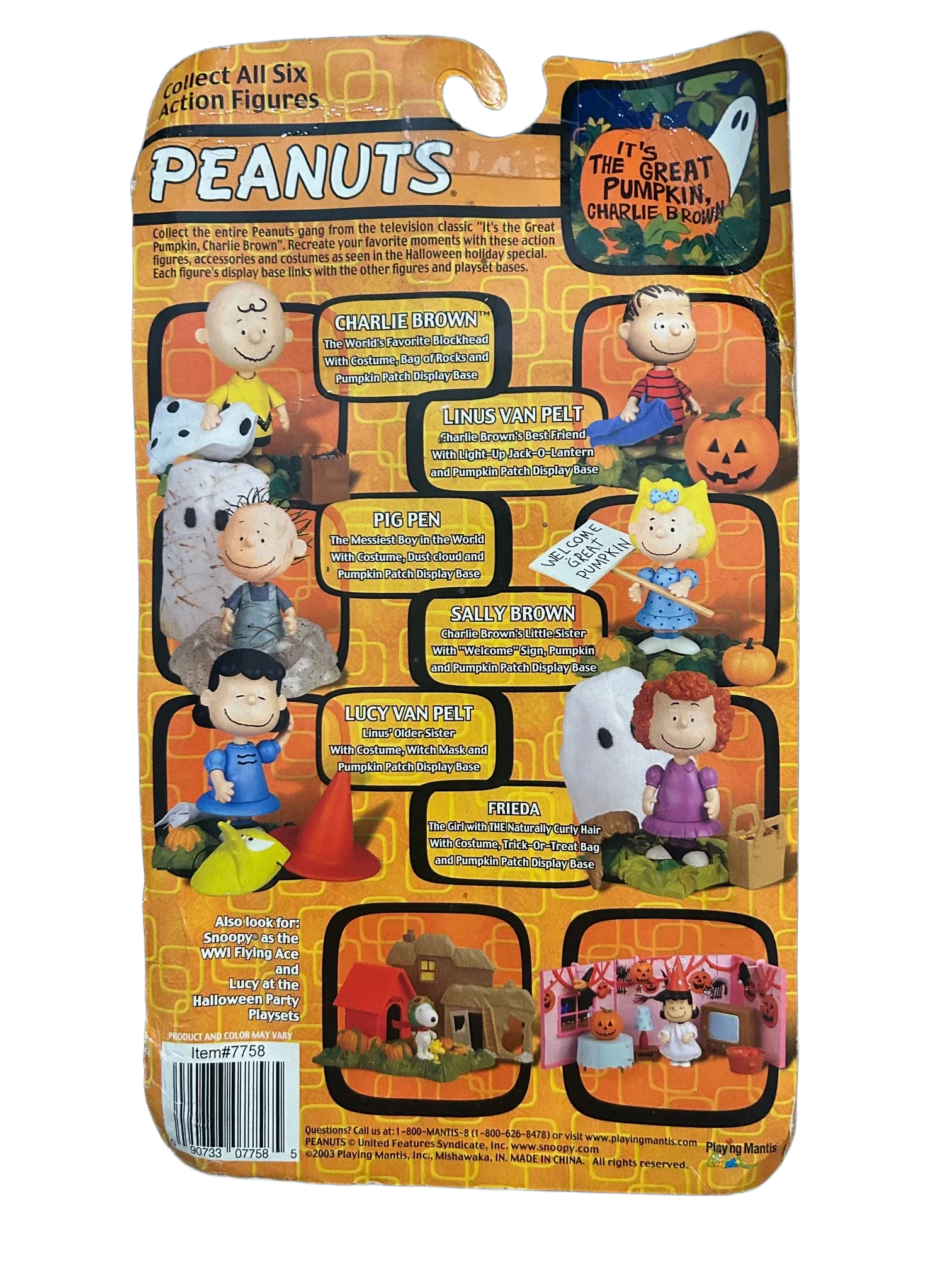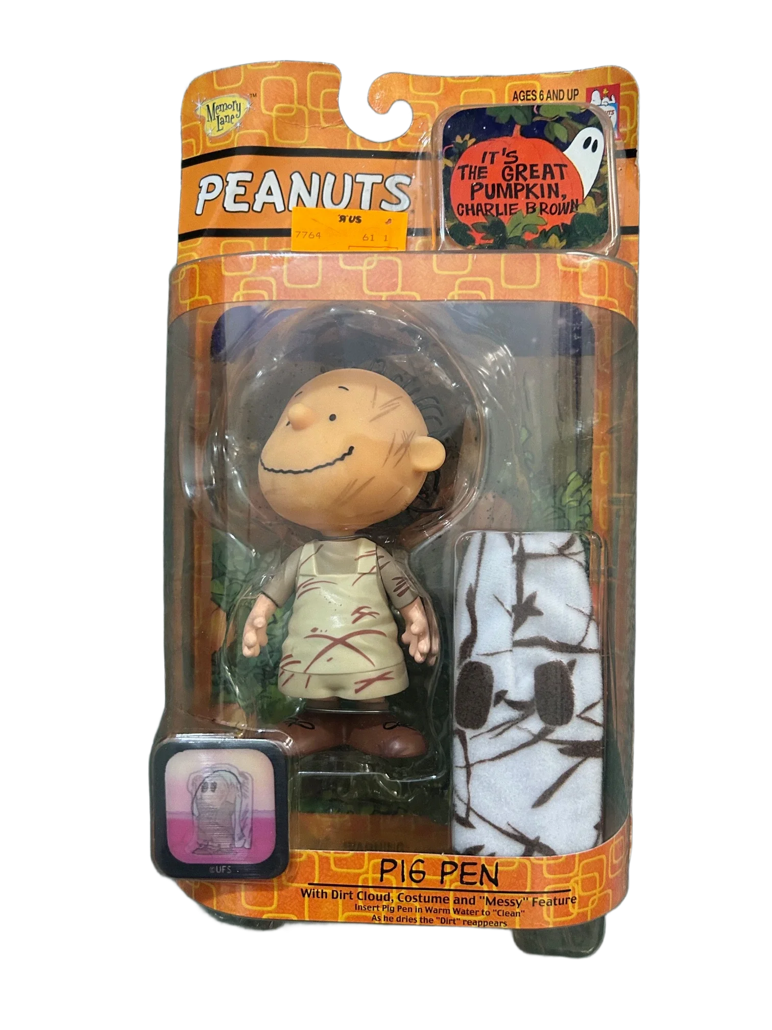 Peanuts Memory Lane Pig-Pen collectible figure featuring dirt-themed costume and interactive feature. Sealed packaging with minor wear.