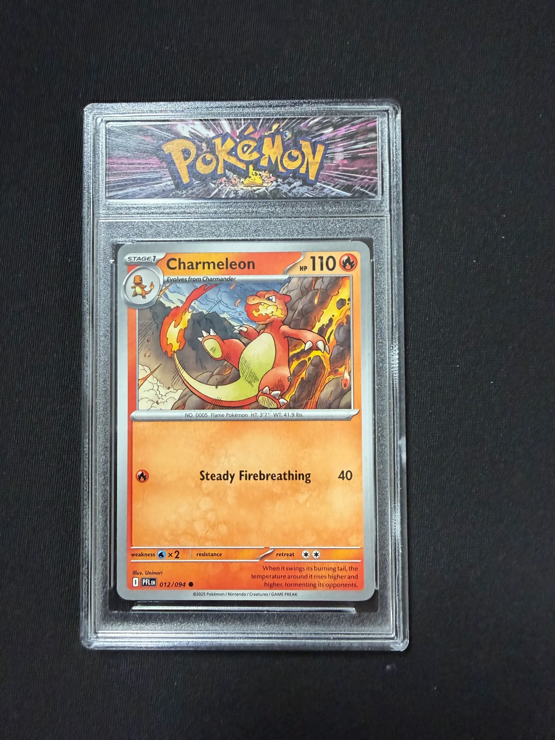 Pokémon Charmeleon trading card featuring the evolution of Charmander. Displayed in protective case.