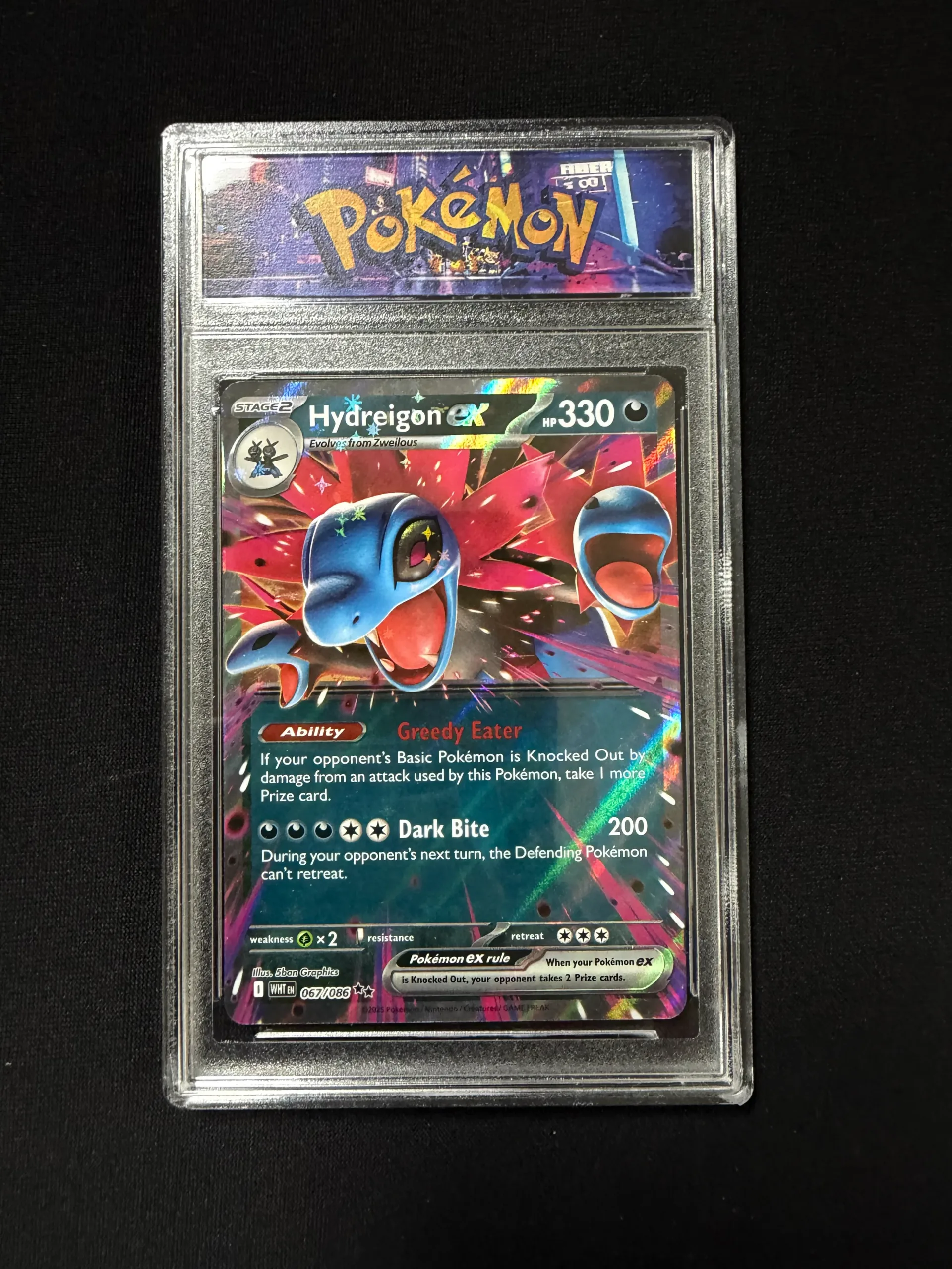 Pokémon Hydreigon ex card with holographic artwork and 330 HP. Displayed in protective case.