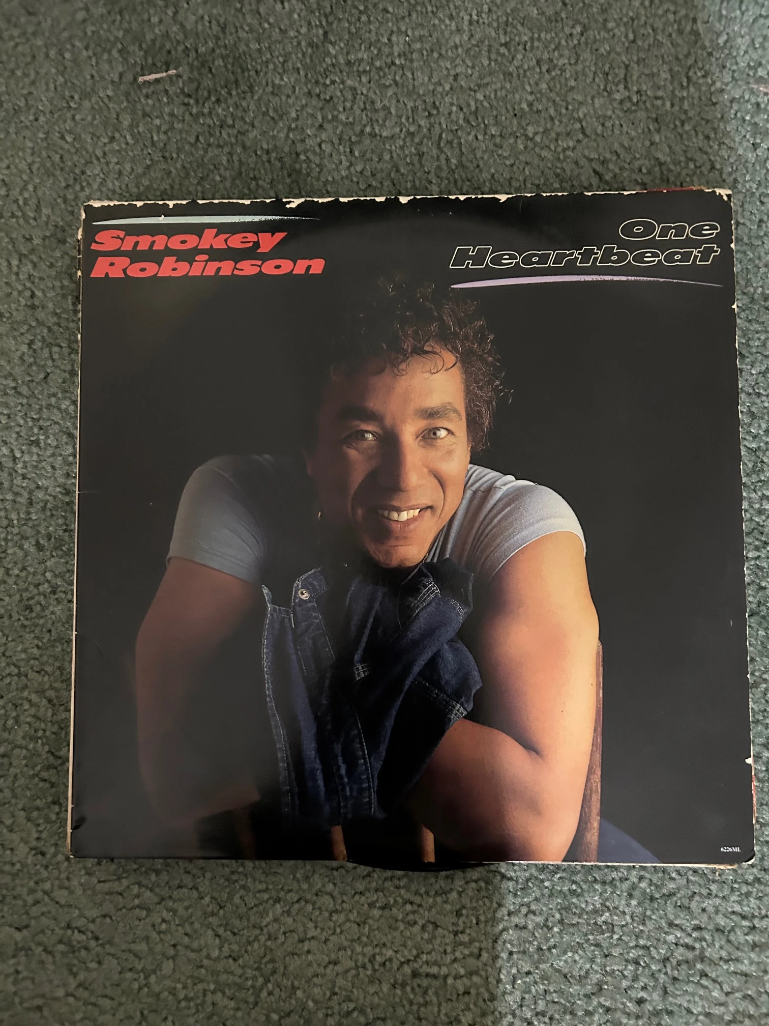 Smokey Robinson ‘One Heartbeat’ album. Vintage Motown-era record. Cover shows moderate wear. Vinyl condition not tested. Sold as-is.