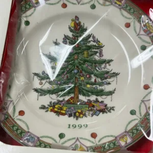 Spode Christmas Tree collector plate dated 1999 featuring classic holiday design. Comes in original box with protective plastic. Box shows wear and staining from storage. Plate appears intact. Great seasonal collectible.