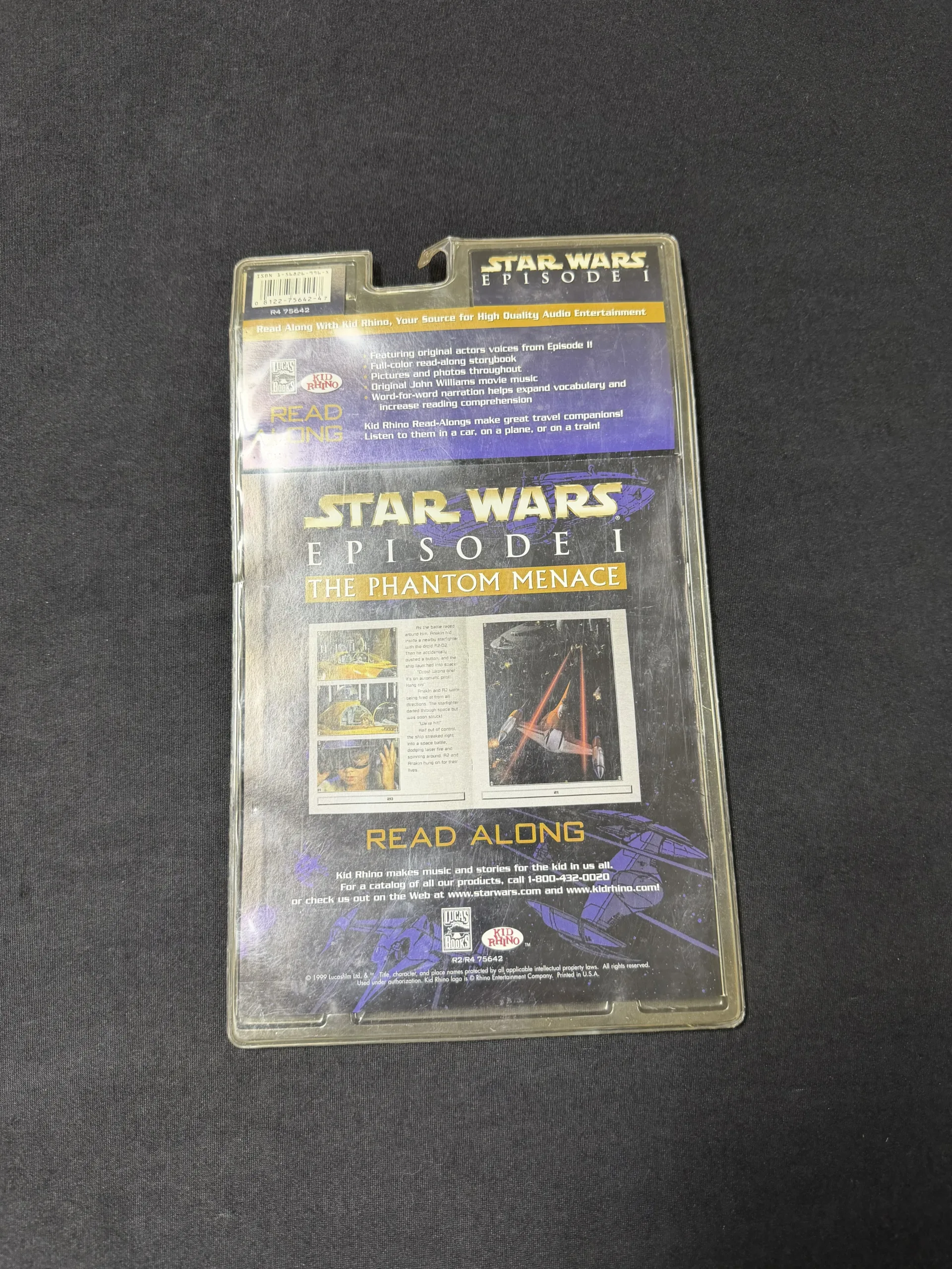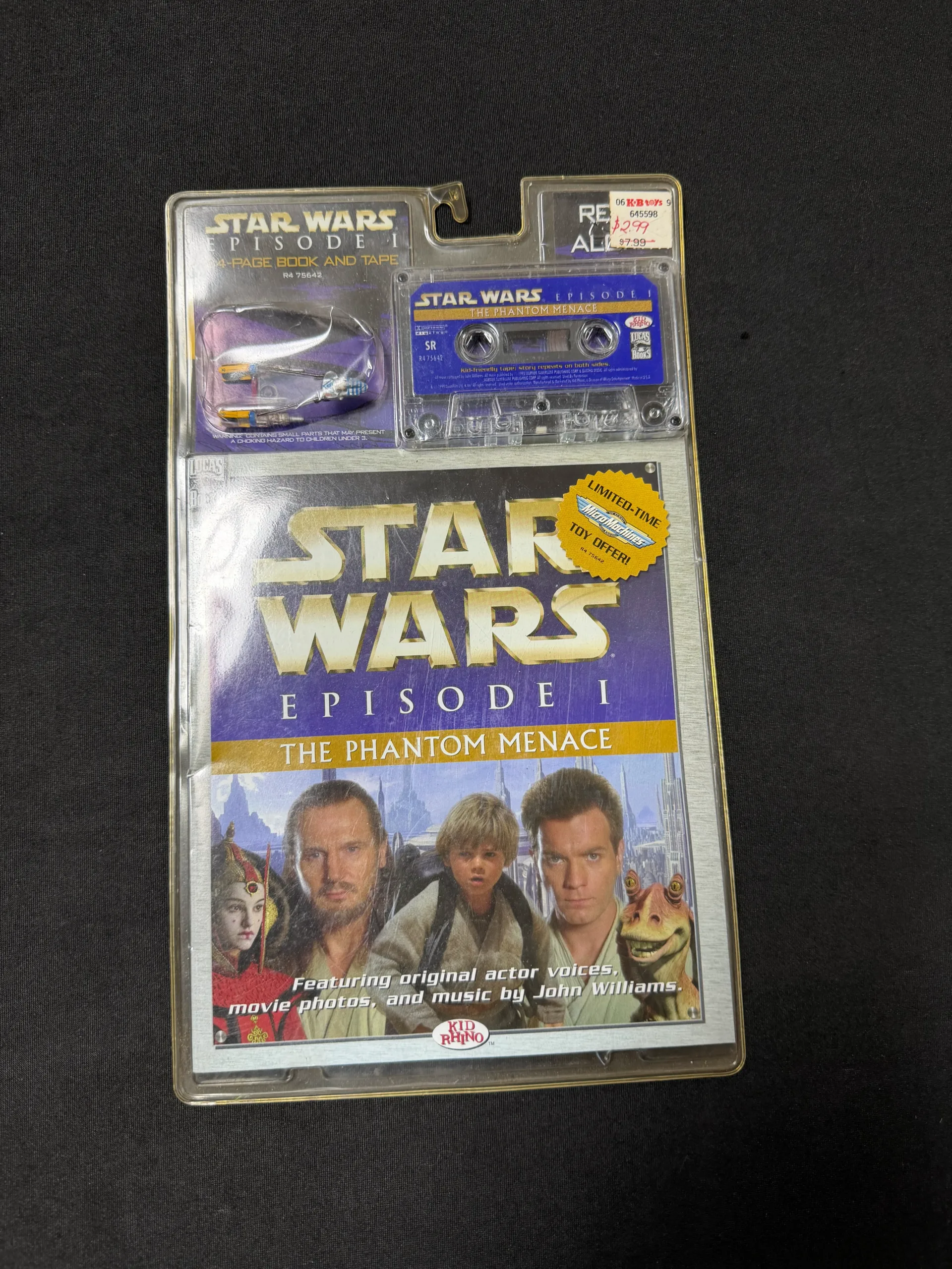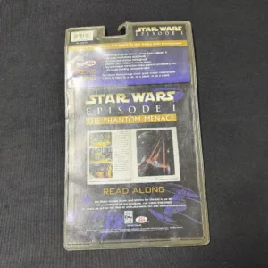 Star Wars Episode I: The Phantom Menace book and cassette set featuring original actor voices and music. Includes bonus toy. Factory sealed packaging with visible price sticker and shelf wear. Great collectible for Star Wars fans.