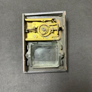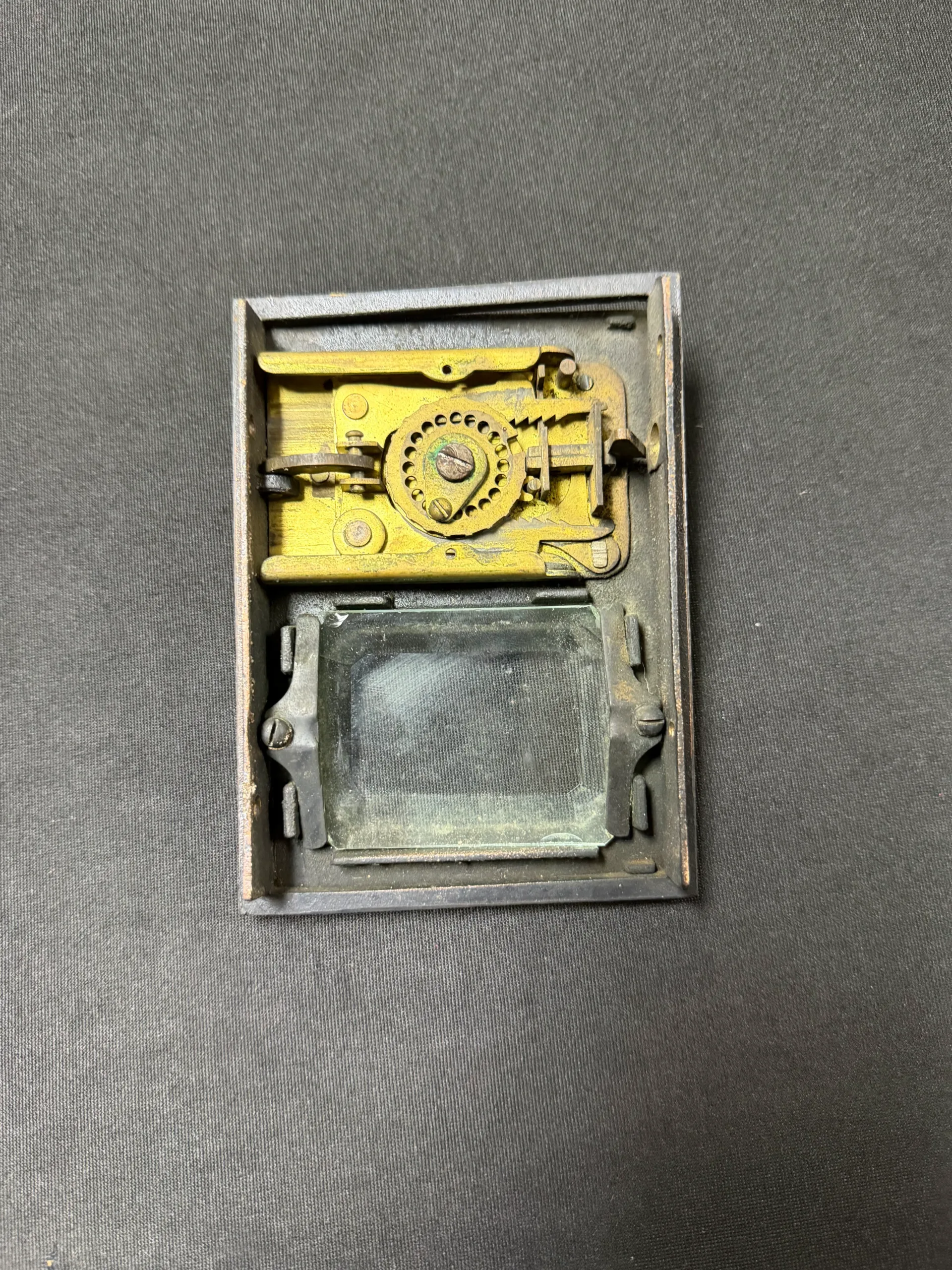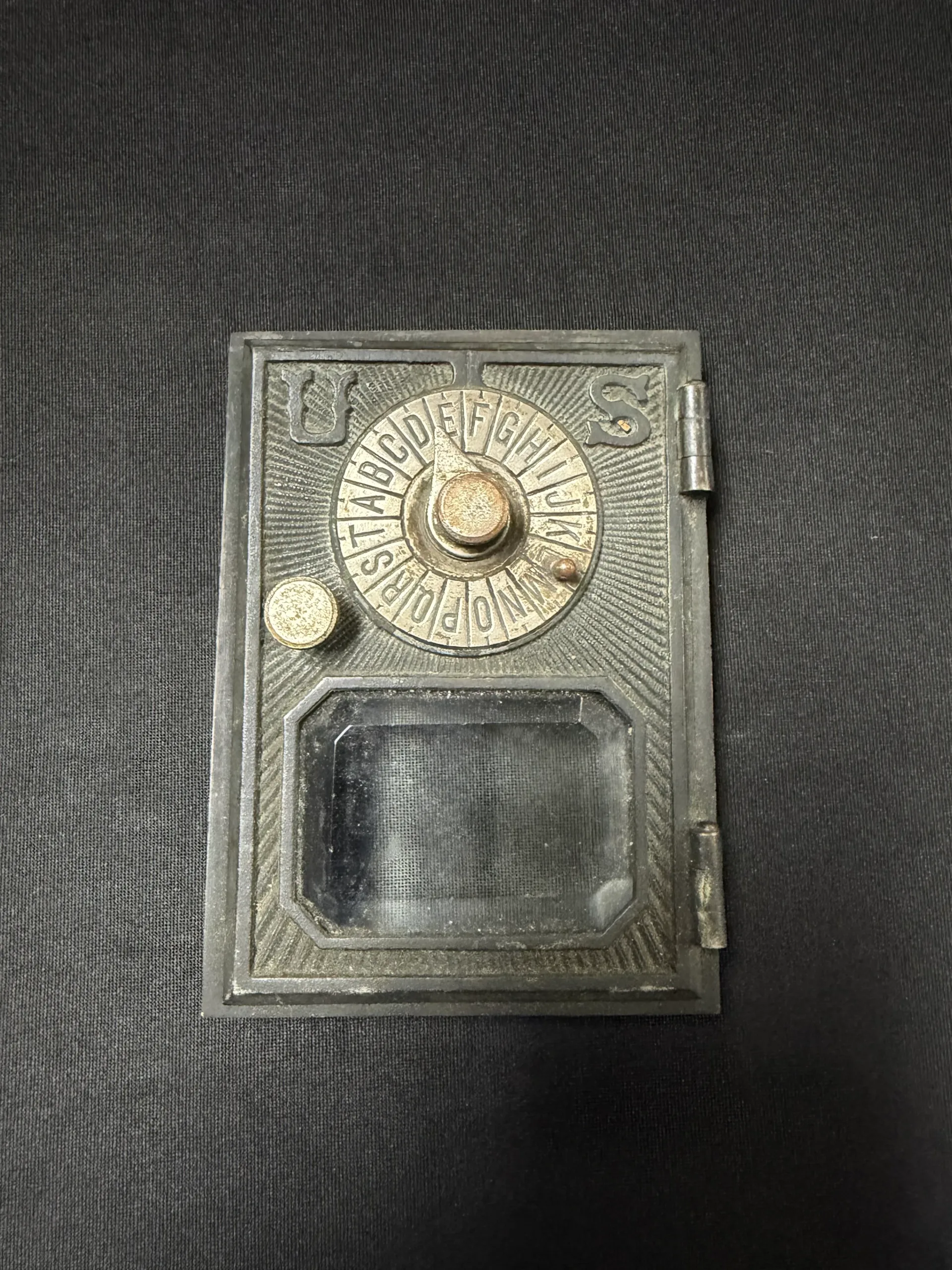 Vintage metal lock box or safe-style bank featuring combination dial face and hinged door. Shows wear and patina consistent with age. Functionality not tested. Unique decorative or collectible item.