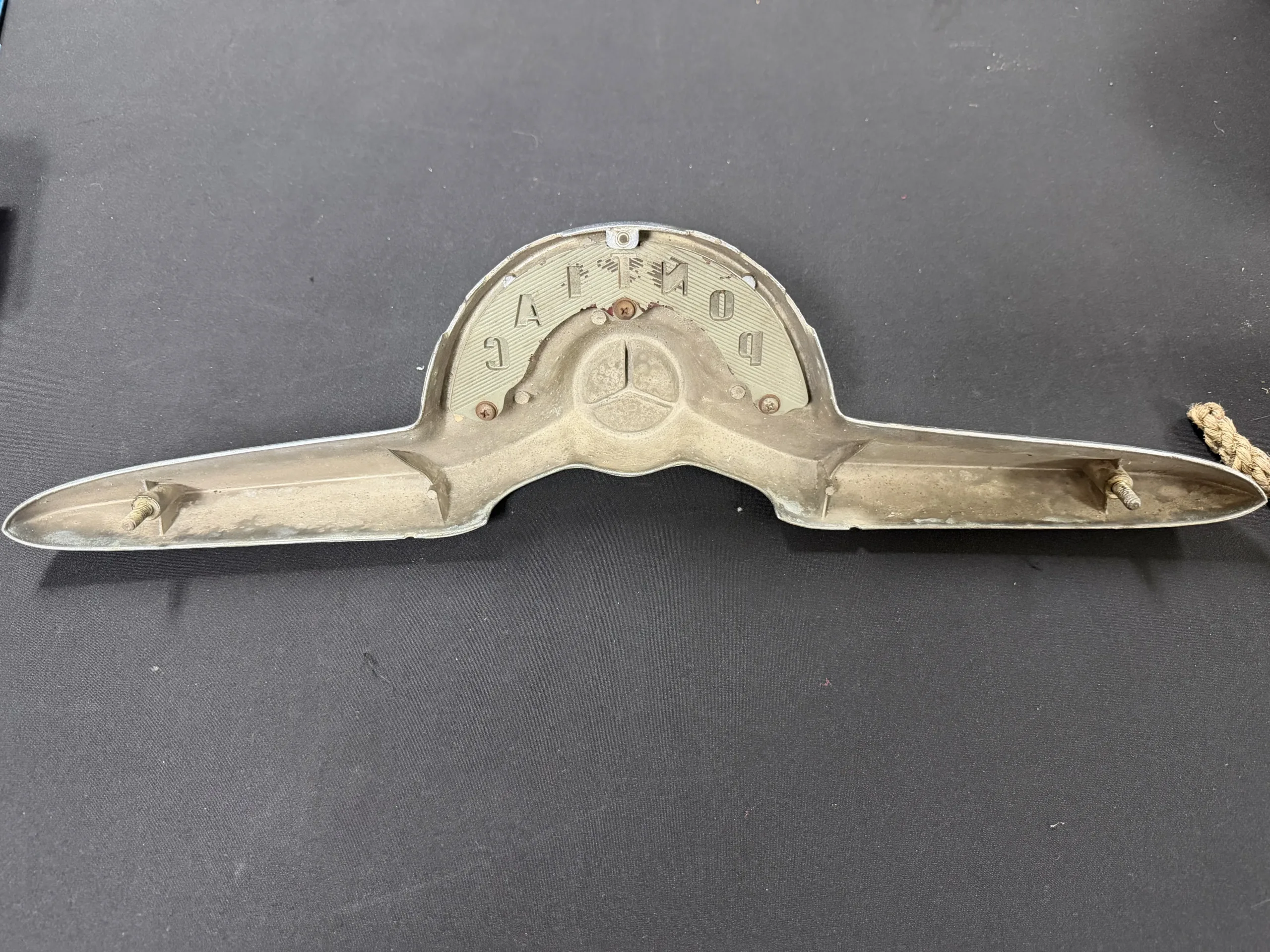 Vintage Pontiac automobile emblem badge featuring the Pontiac name and arrowhead emblem. Shows age-related wear consistent with vintage automotive parts.