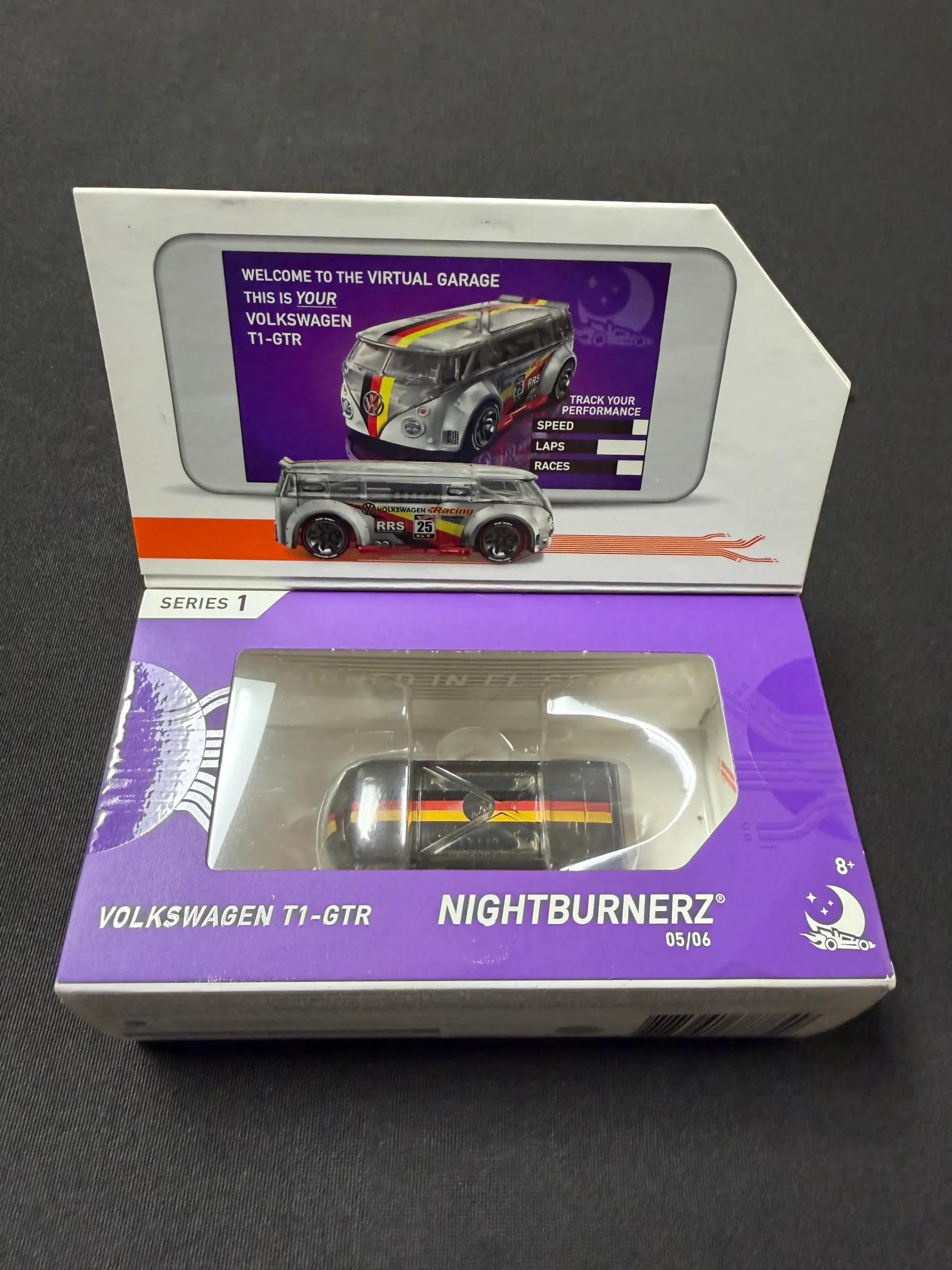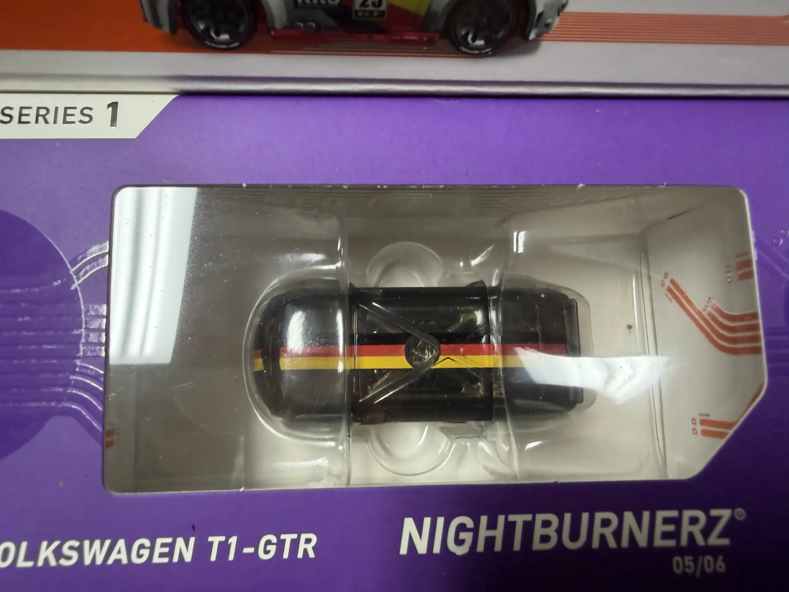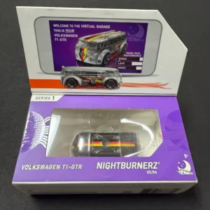 Volkswagen T1-GTR diecast vehicle from Nightburnerz Series 1. Comes in original display packaging. Box shows some wear from storage. Great collectible for diecast and toy collectors.