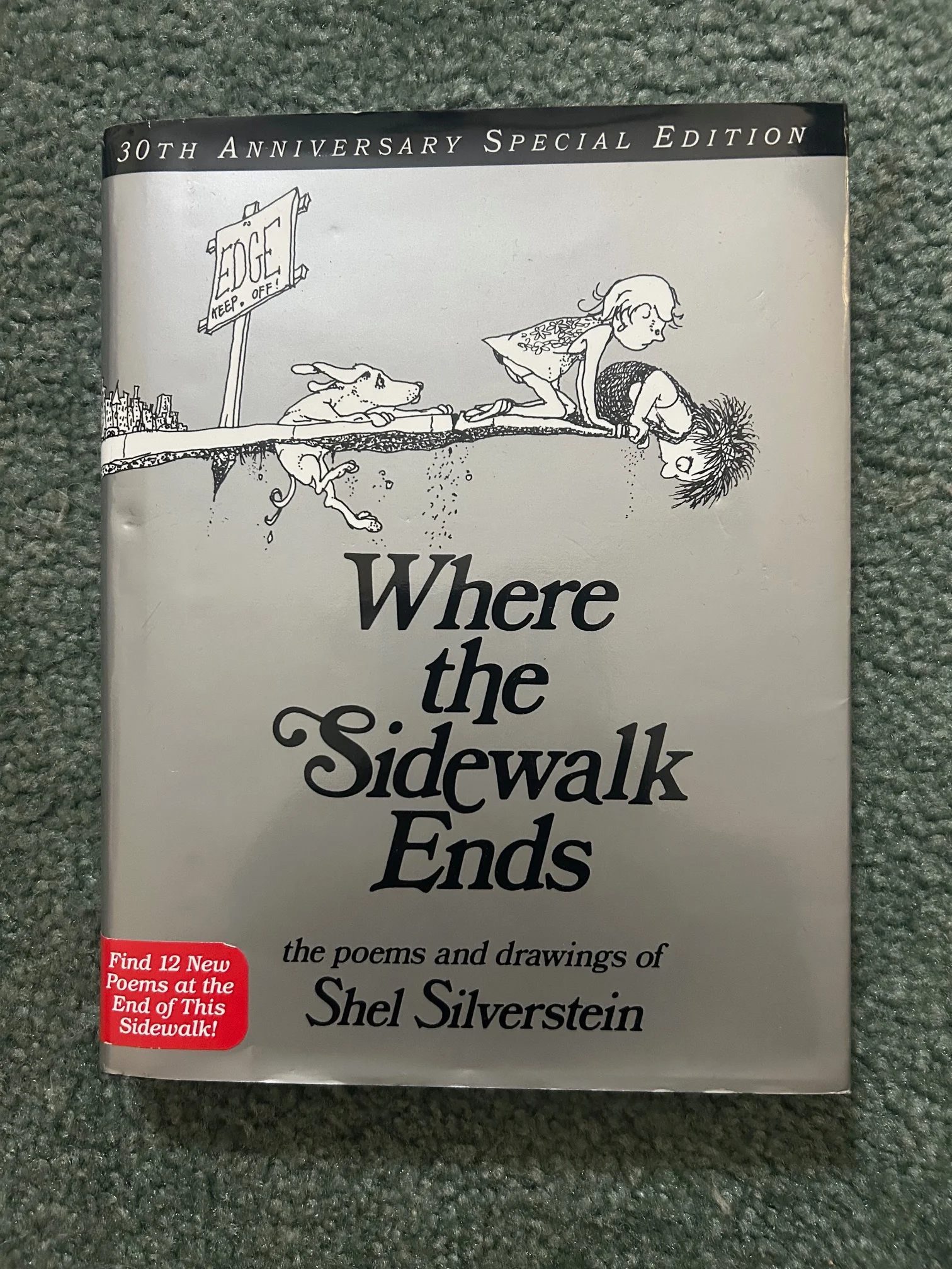 Where the Sidewalk Ends by Shel Silverstein, 30th Anniversary Special Edition hardcover. Includes poems and drawings, with note on cover for 12 new poems at the end of the book. Pre-owned with visible cover wear. Sold as-is.
